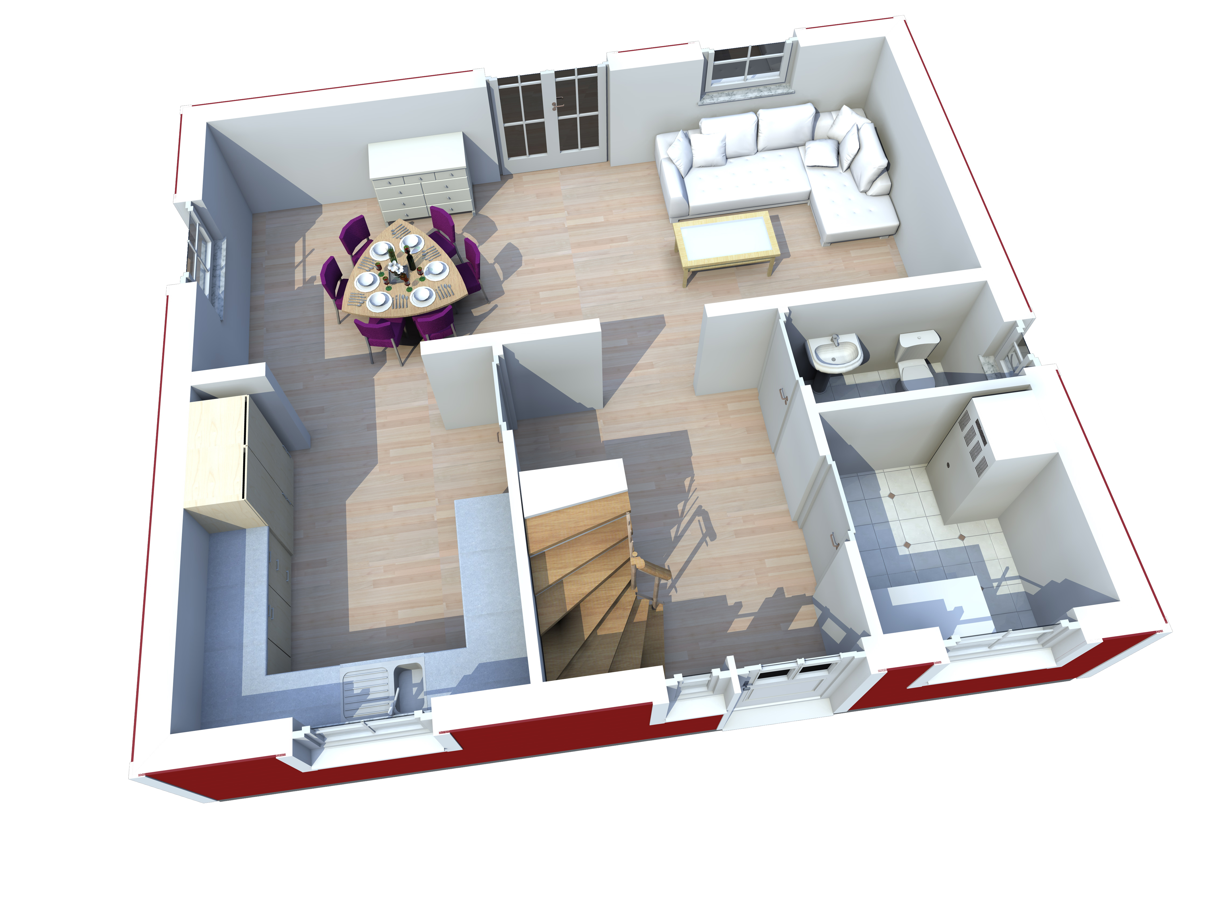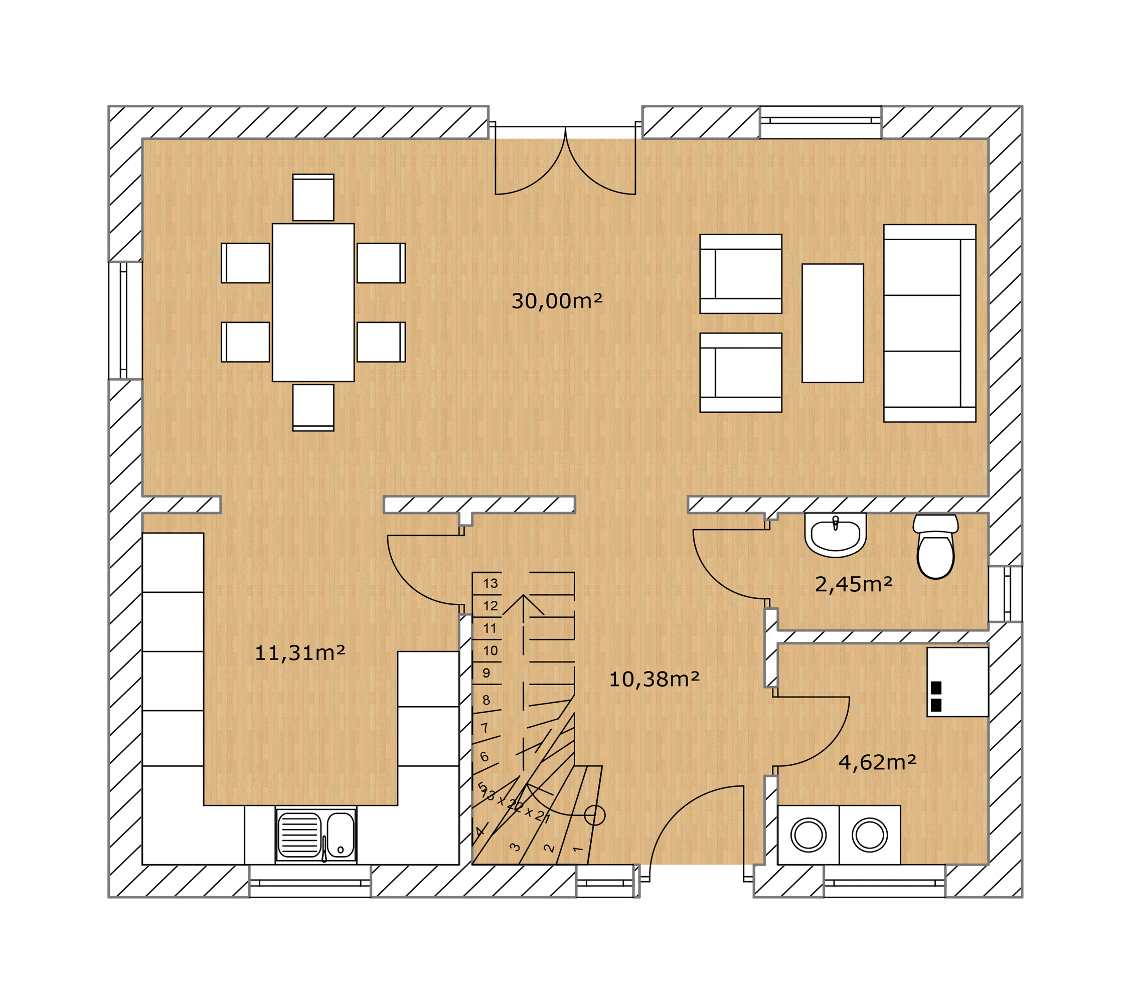Im Erdgeschoss befindet sich der offen gestaltete Wohn-, Ess- und Kochbereich, der das Herzstück des Hauses bildet. Durch große Fensterflächen wirkt der Raum hell und freundlich und bietet einen fließenden Übergang zwischen Wohnen, Kochen und Essen. Der Wohnbereich lädt zum Entspannen ein, während der Essbereich genügend Platz für gemeinsame Mahlzeiten bietet. Die funktional geplante Küche fügt sich harmonisch in den Raum ein und ist optimal auf den Alltag sowie auf Urlaubsaufenthalte ausgelegt. Ergänzt wird das Erdgeschoss durch ein Gäste-WC sowie einen praktischen Hauswirtschaftsraum, der zusätzlichen Stauraum und Platz für Haustechnik bietet.