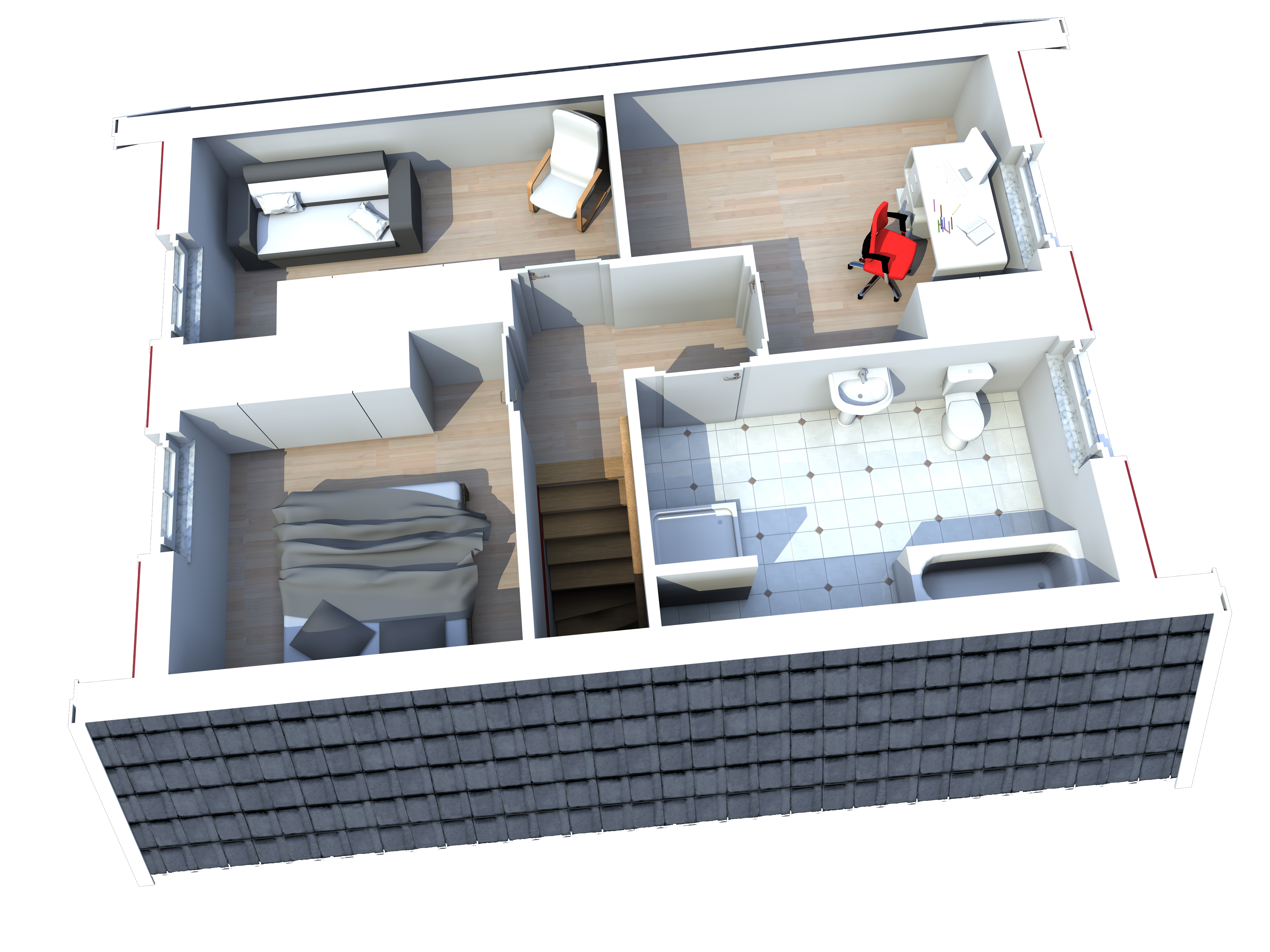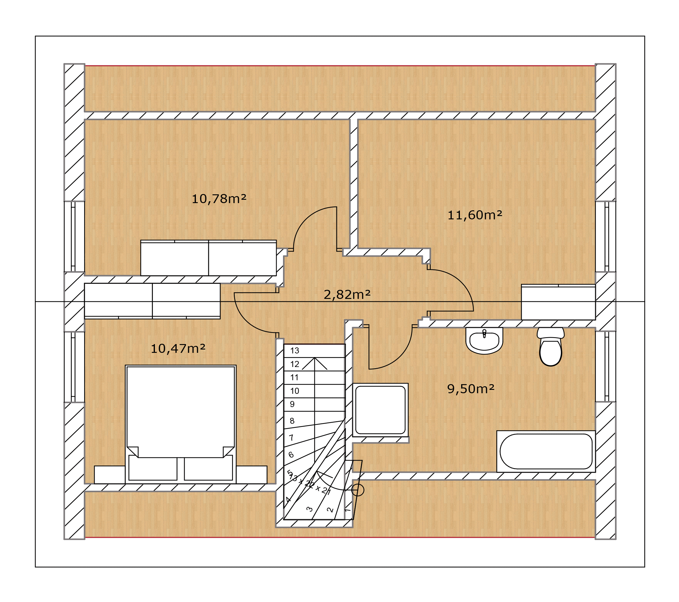 Das Obergeschoss der Krone 100 ist als ruhiger Rückzugsbereich konzipiert. Hier stehen drei Schlafzimmer zur Verfügung, die flexibel als Eltern-, Kinder- oder Gästezimmer genutzt werden können. Ein gut geschnittenes Badezimmer mit Dusche sorgt für Komfort und Funktionalität. Die Trennung von Wohn- und Schlafbereichen unterstützt eine klare Raumaufteilung und trägt zu einem angenehmen Wohnklima bei.