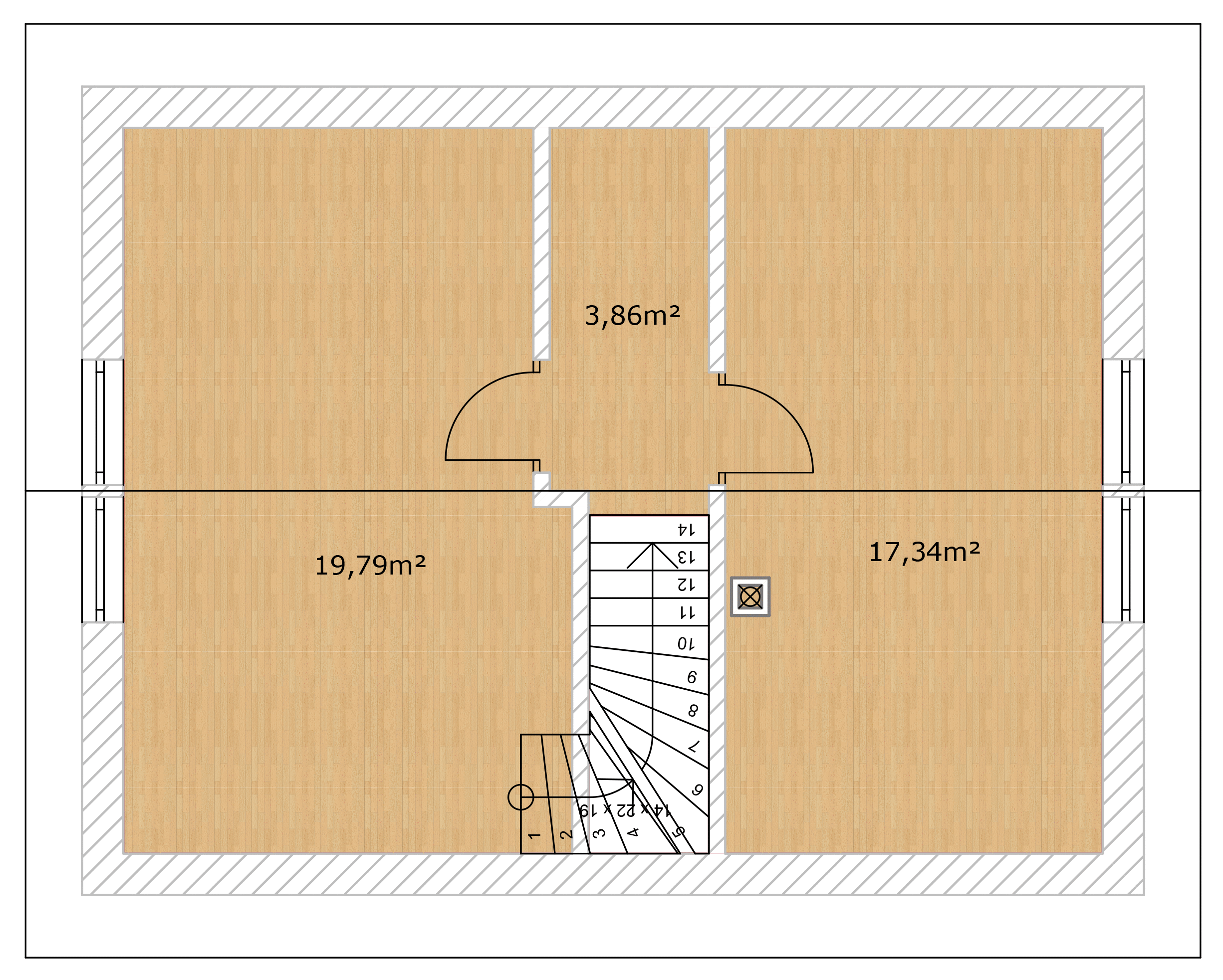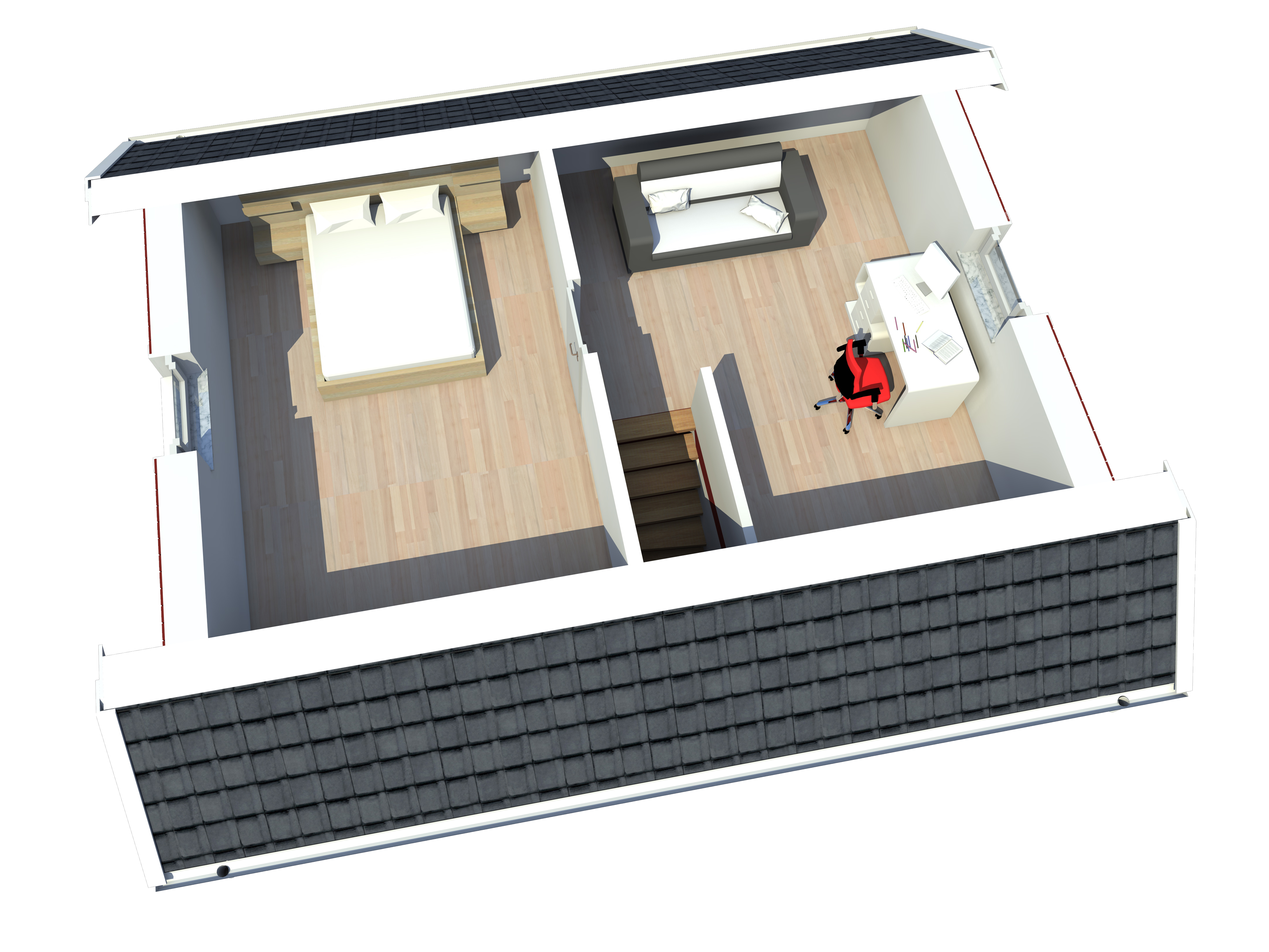 Über eine Treppe gelangen Sie in das Obergeschoss, wo zwei weitere Schlafzimmer zusätzliche Rückzugsorte und Schlafmöglichkeiten schaffen. Die Anordnung der Räume sorgt für eine klare Struktur, die sowohl Privatsphäre als auch Gemeinschaft unter einem Dach ermöglicht.